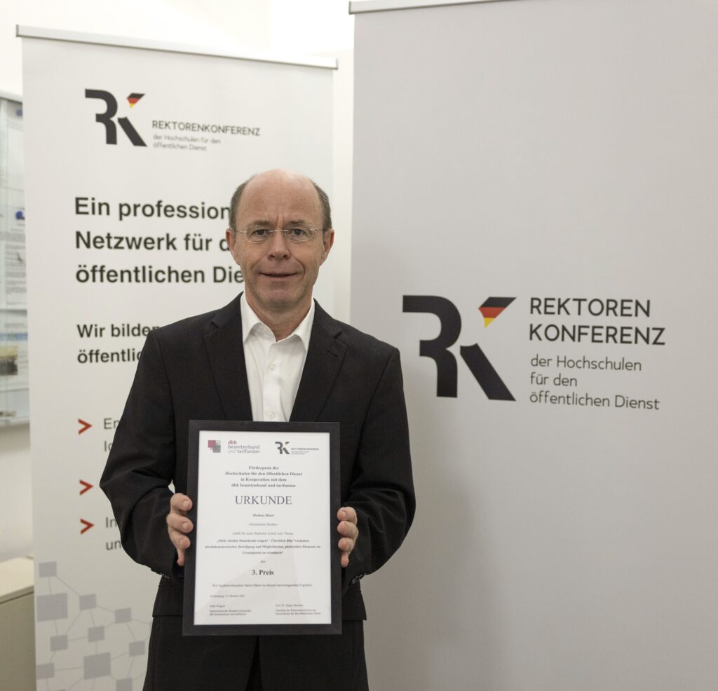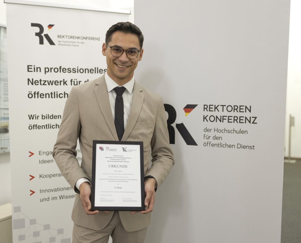 Wie bereits seit 2017 wurden auch im Jahr 2025 auf der Herbstkonferenz der Hochschulen für den öffentlichen Dienst in Hachenburg die besten drei Arbeiten prämiert. Für den dbb-Preis hatte die Jury eine Auswahl zwischen 17 eingereichten Arbeiten, die sich in Form und Inhalten zum Teil erheblich unterschieden. Bei den Einreichungen gab es zahlreiche Arbeiten aus dem Bereich der allgemeinen Verwaltung, einerseits zu wirtschaftlichen Themen, andererseits zu rechtlichen Fragestellungen und Themen. Einen wichtigen Schwerpunkt stellten erneut die Arbeiten aus der innovativen Polizeiarbeit dar. Hier waren aktuelle Themen vertreten, wie z. B. Multimediaforensik von Bilddateien oder Platzverweise und deren ordnungsunterstützende Wirkung bei Problemgruppen.